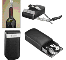 - Four-piece set contains travel case, stainless steel corkscrew, pour spout and spout stopper